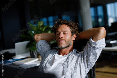 A relaxed man leans back in an office chair with eyes closed, embodying a sense of serenity and contentment in a well-lit indoor workspace filled with greenery.
