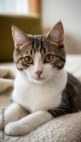 A relaxed tabby and white cat with soft, striped fur lounges on a textured brown blanket, its curious eyes looking forward, capturing the calm essence of domestic feline life