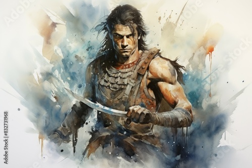 fluid, transparent, washes, delicate, subtile, colours, wallpaper, desktop, background, art, pen, paper, generative, ai, watercolor, style, illustration, mystic, indomitable, warrior, resolve, loyalty, fantasy, bathe, in, fiery, light, stand, resolute, sword, raised, eye, ablaze, professional, artist, designer, photographer, warrior, determination, captivating