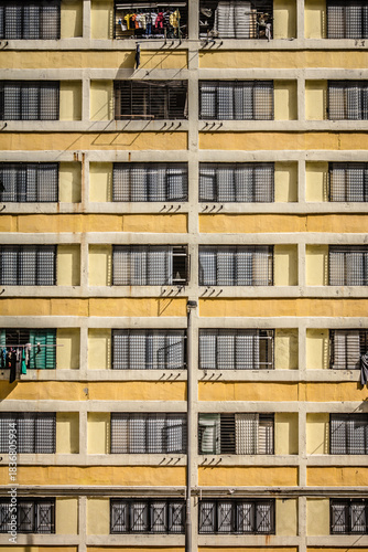 A repetitive facade of a yellow-beige residential building with metal grilles and hanging laundry, capturing high-density urban living.