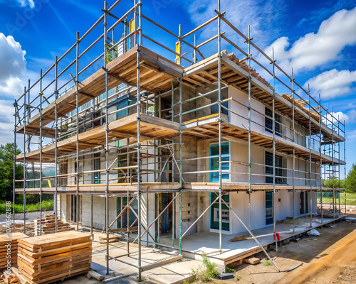 construction, building, scaffold, structure, residential, progress, sky, architecture, growth, framework, development, project, engineering, blue, outdoors, industrial, site, build, scaffolding, future, beam, labor, tool, foundation, design, urban, complex, assemble, new, material, innovation, secure, housing, process, formwork, renovate