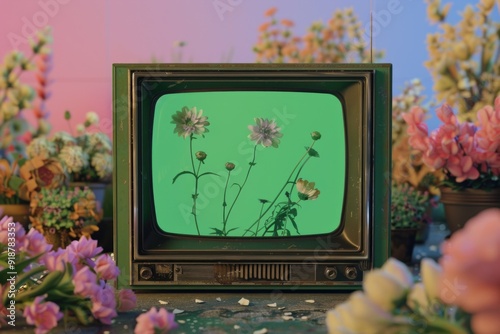 A retro TV set with fresh flowers arranged in front of it
