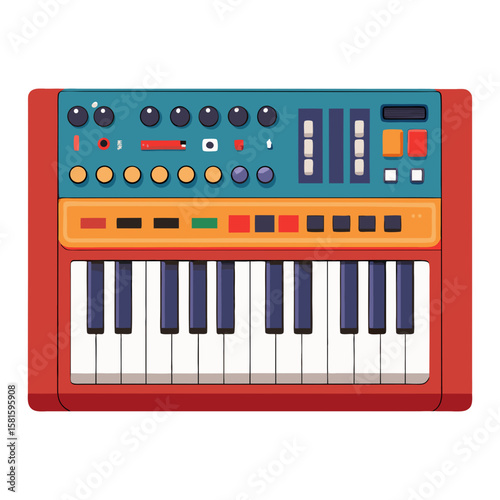 synthesizer, keyboard, music, musical instrument, retro, vintage, sound engineering, midi, sound, melody, harmony, rythm, performance, concert, musician, artist, dj, producer, studio, recording, stage, entertainment, technology, innovation, electronic, funky, colourful, buttons, knob, key, illustration, graphic, icon, vector