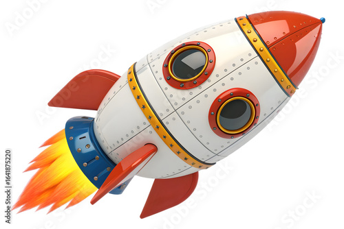 A retrostyle rocket ship with red fins and accents, emitting fiery exhaust, soaring through space isolated on a transparent background
