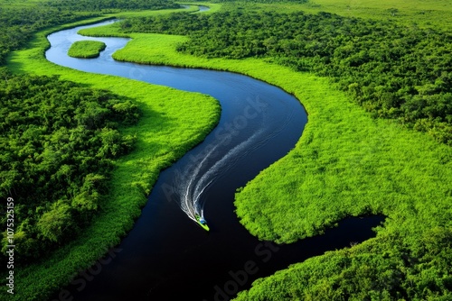 river, winding, through, jungle, crystal-clear, water, plant, along, bank