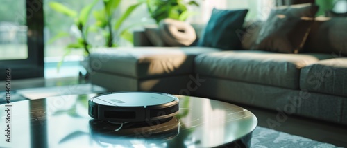 A robot vacuum navigates a sunlit living room, reflecting modern smart home design, where technology simplifies and enhances everyday life.
