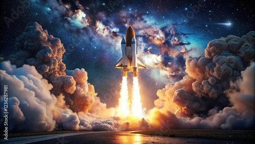 A rocket with a powerful engine blasting off from a launchpad, leaving a trail of flames and smoke behind, against a dark and starry night sky , high energy launch, rocket propulsion
