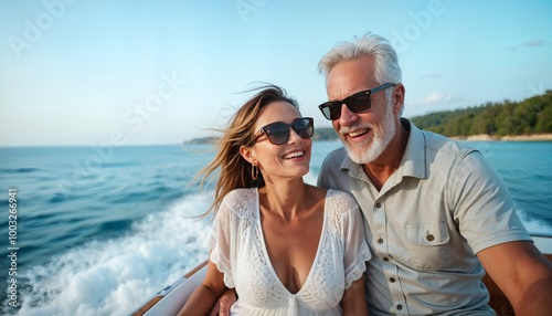 A romantic couple enjoys a luxurious yacht cruise , together in a scenic ocean setting