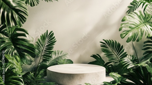 A round, white stone pedestal in the center, surrounded by lush, green tropical leaves on both sides.