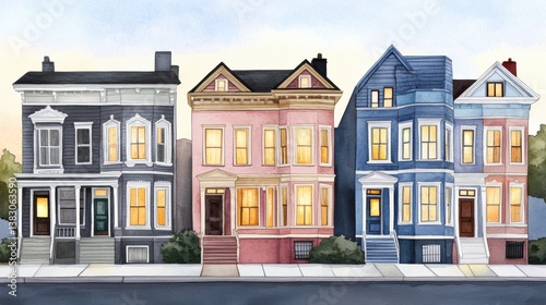 A row of charming, colorful houses with warm lights glowing from their windows, set against a soft, watercolor-style background.