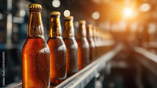 A row of chilled beer bottles glistens under bright lighting, inviting refreshment, symbolizing leisure moments and vibrant social interactions.