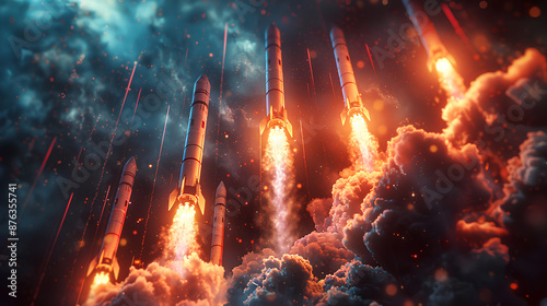 A row of futuristic rockets take off from the ground,