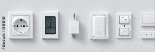 A row of minimalist white electrical wall plates, including an outlet, dimmer, light switch, and smart plugs, displayed against a seamless white backdrop