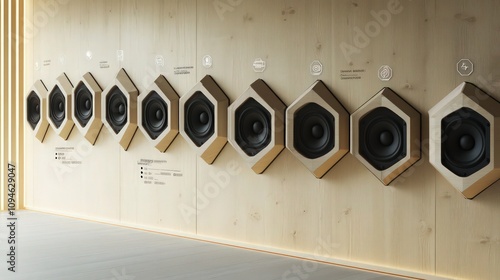 A row of modern hexagonal audio speakers displayed in increasing size along a light wood-paneled wall for product review.