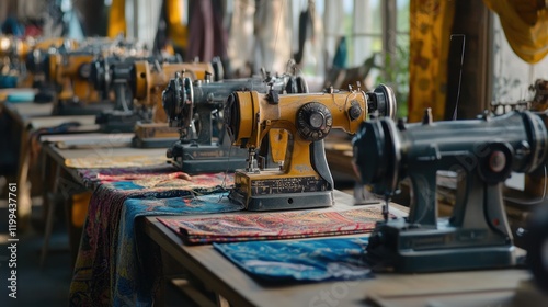 A row of sewing machines on a worktable surrounded by colorful fabric and thread.