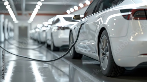 A row of white cars are plugged in and charging, with a focus on the rear tire of the car closest to the viewer. The cars are parked in a sleek, modern showroom.