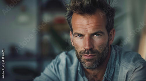 introspective, portrait, depth, sharpened, indoor, emotion, compelling, serious, thoughtful, facial hair, candid, contemplation, mature, character, storytelling, masculinity, realism, humanity, confidence, solitude, expressive, natural light, brown hair, bristle, captivating, striking, closeup, moody, strength, individual, casual attire, personal, modern, journey, resilience, understanding, profound