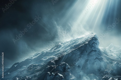 A rugged mountain rises dramatically in a dark environment, illuminated by gentle rays of light from above. The atmosphere is mystic, with a hint of fog enveloping the terrain