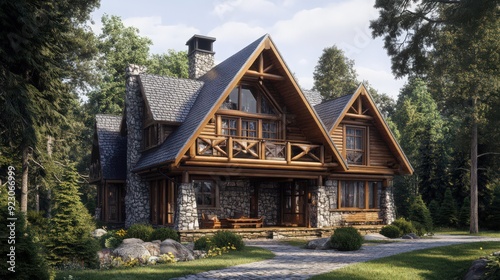 A rustic 2-storey house with a cozy, homely feel, including wooden cladding, a large stone fireplace,