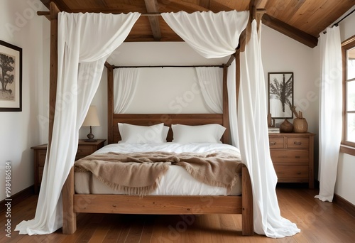 A rustic and cozy bedroom with a wooden canopy bed, white curtains, and wooden floors.