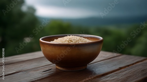 rustic, ceramic, bowl, rice, wooden, table, landscape, food, grain, natural, organic, raw, uncooked, ingredient, staple, healthy, nourishment, brown, pottery, dish, wood, nature, background, blurred, green, tree, hill, mountain, sky, cloud, overcast, moody, atmosphere, twilight, evening, dusk, serene, calm, simple, country, rural, harvest, cereal, closeup, earthy, outdoors