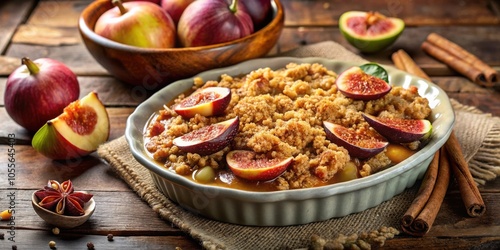 A Rustic Fall Dessert of Fig and Apple Crumble with a Crunchy Topping and Cinnamon Sticks
