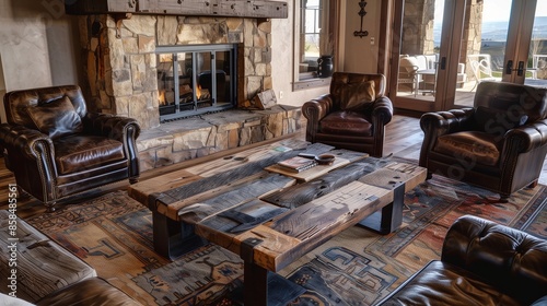 A rustic living room with a reclaimed wood coffee table, a set of leather armchairs, and a large, stone fireplace