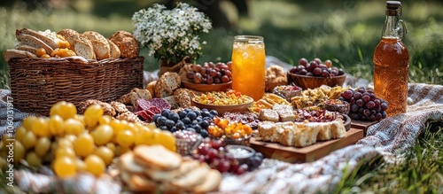 A Rustic Summer Picnic Spread with Bread, Fruit, and Beverages