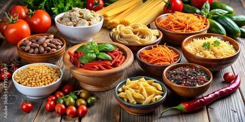 A Rustic Tabletop Display of Various Pasta Shapes and Ingredients, Pasta, Food, Italian, Cuisine