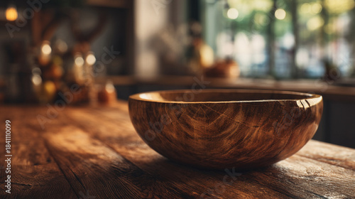 wooden bowl, bowl, rustic, wood, table, kitchen, empty, food preparation, display, natural, organic, countryside, farmhouse, kitchen utensile, tabletop, surface, craftsmanship, interior, background, still life, natural light, sunlit, decor, serving