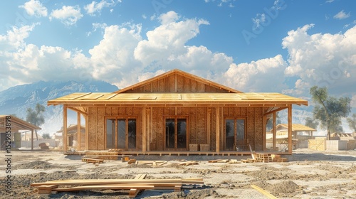 A rustic wooden house stands proudly against a blue sky with fluffy clouds, symbolizing craftsmanship, warmth, and the simplicity of country living amidst nature's beauty.