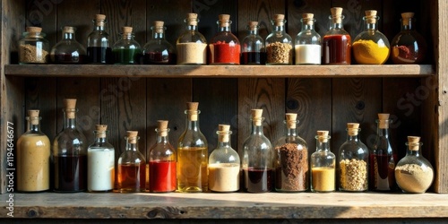 spice, sauce, grain, glass bottle, rustic, sunlight, condiment, ingredient, cooking, food, pantry, kitchen, home, still life, arrangement, display, collection, variety, assortment, favor, texture, colours, natural light