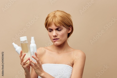 a sad, upset woman with short hair, wrapped in a towel, stands on a beige background holding various jars of care cosmetics in her hands, looking very sad