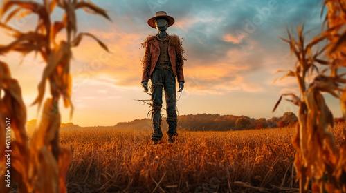 a scarecrow standing tall in picturesque countryside, surrounded by golden fields and colorful sunset, AI-Generated