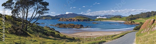A scenic coastal view featuring a sandy beach, rocky outcrops, lush greenery, and distant hills under a clear blue sky.
