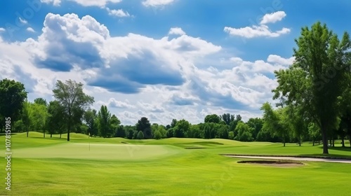 golf, course, landscape, green, sky, cloud, tree, nature, sport, leisure, fairway, putting, sand, trap, grass, summer, sunny, blue, horizon, scenery, recreation, activity, peaceful, calmness, environment, relaxation, greenery, field, view, sunshine, beauty, open, space, scenic, vibrant, healthy, lush, play, exercise, challenge, club, swing, enjoyment