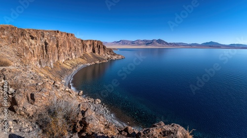 lake, water, sky, mountain, cliff, shore, coast, beach, landscape, nature, outdoors, scenic, blue, clear, rock, stone, gravel, terrain, elevated, view, horizon, perspective, sunny, sunlight, shadow, arid, desolate, environment, wilderness, huge, calm, tranquil, serene, depth, texture, pattern, detail, erosion, geology, formation, ecosystem, untouched, quiet, beauty, bay, panorama, daytime