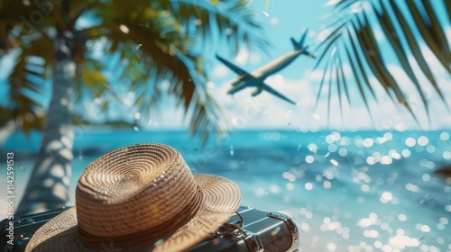 A scenic travel moment a straw hat on a suitcase by the sea with an airplane above
