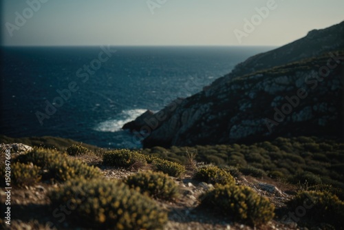 A scenic view of the ocean from the top of a hill, ideal for use in travel or nature-related projects