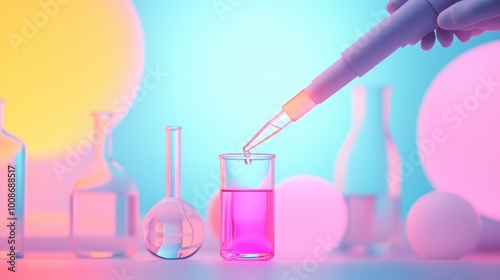 A scientist carefully pipettes a brightly colored liquid into a test tube, surrounded by other lab equipment and beakers.