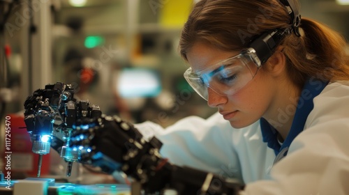A scientist controlling robotic arms using wearable technology, precision engineering