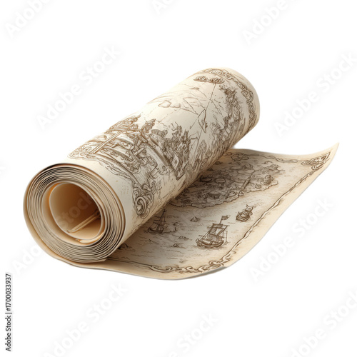 A scroll of paper with a map of a ship on it
