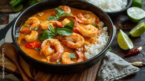 A seafood curry with coconut milk, shrimp, fish, and aromatic Thai spices, served with jasmine rice.