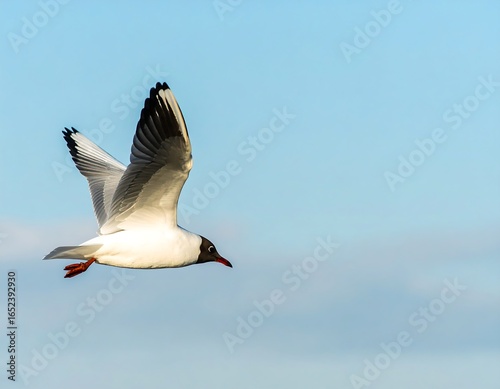 seagull, flight, sky, bird, wingspan, white, black, red, feather, animal, nature, flying, graceful, soaring, clear, blue, horizon, wildlife, photo, beautiful, moment, birding, skyward, aerial