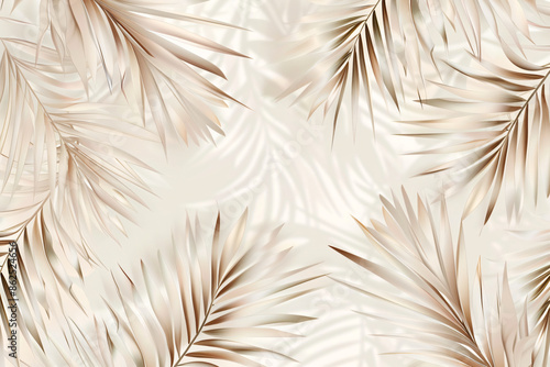 A seamless pattern of light beige palm leaves, with subtle gradients and soft lighting. The design is elegant and modern, perfect for wallpaper or interior decor. Soft background colors to enhance the
