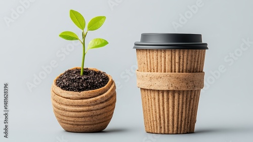 A seedling grows in a pot placed beside a paper cup filled with coffee on a light gray background plain studio.