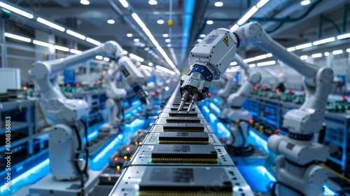 A semiconductor fabrication plant where robotic arms and technicians in clean suits assemble microchips under blue lights