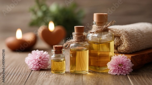 A serene arrangement of essential oil bottles with candles and flowers for a relaxing spa experience