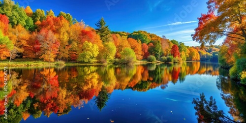 A serene autumn scene with vibrant leaves against a clear blue sky, surrounded by lush greenery and towering trees , autumn colors, autumn landscape