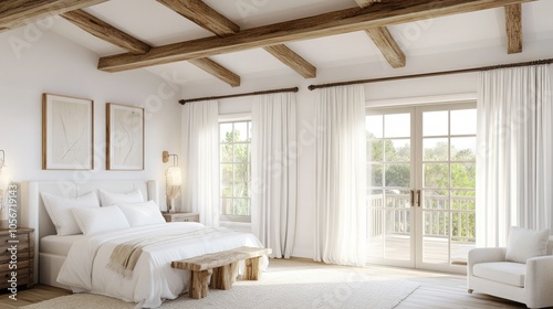A serene bedroom in a Nordic house with white walls, wooden accents, and large windows allowing